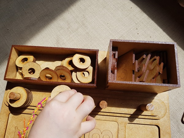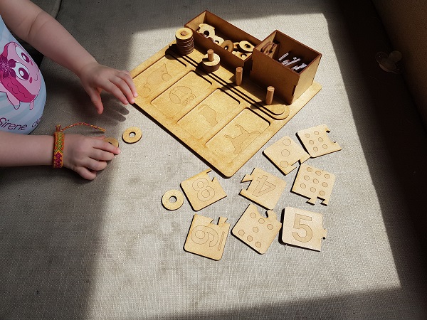 J'ai réalisé il y a peu un petit jeu d'inspiration Montessori pour apprendre à ma fille à compter. Le jeu propose à l'enfant d'assembler des dominos composés, à gauche, d'un chiffre et, à droite, d'un nombre équivalent de pastilles. Ensuite, l'enfant doit empiler le même nombre de rondelles sur une tige. C'est très ludique et approuvé par ma fille…