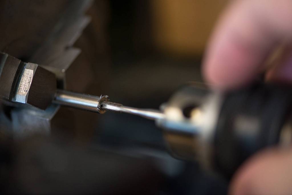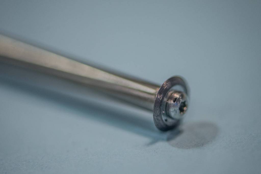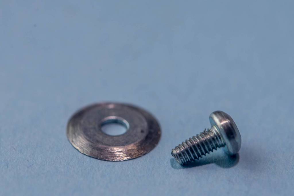 Pour la partie fixe j'ai décidé d'utiliser un un axe en acier inoxydable récupéré dans une vielle imprimante, l’élément traçant (la roulette coupante) sera quand a lui réalisé à partir d'une rondelle limé en biseau d'un coté.