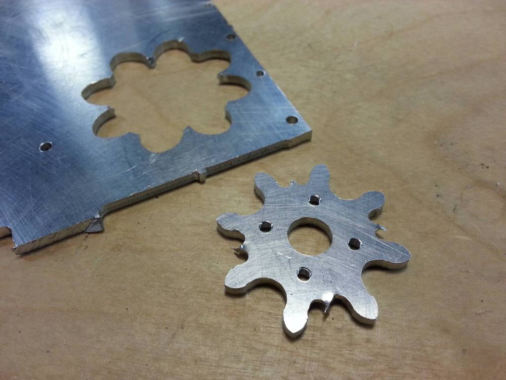Découpe d'un pignon en duralumin sur la défonceuse CNC.