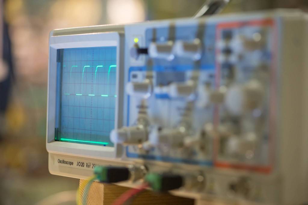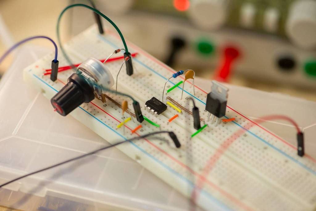 Électronique : essais de montage variateur (leds, moteur, …) PWM à base de NE555. Utilisation de l'oscilloscope (prêté au Fab lab par un usager) pour visualiser la différence de phase.