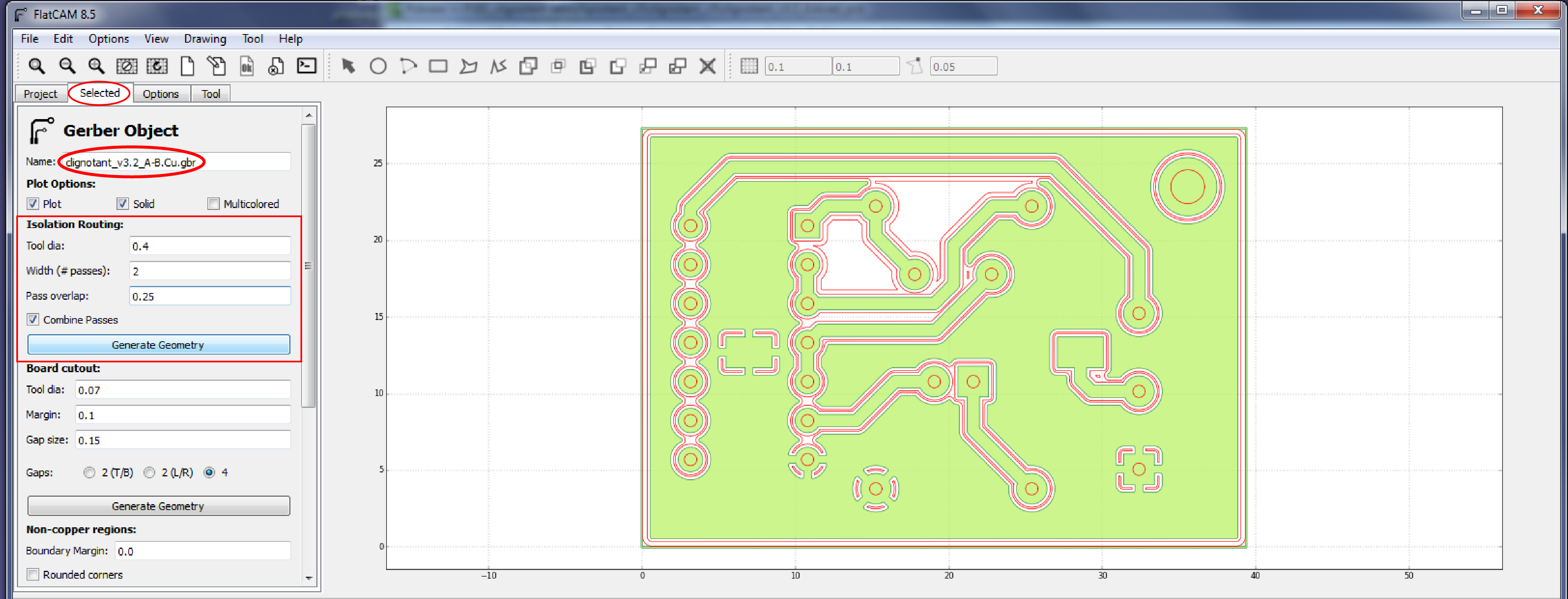 FlatCAM calcule les tracés de gravure à l'anglaise (tracé du contour des pistes afin de les isoler) et les affiche en rouge sur l'aperçu.
