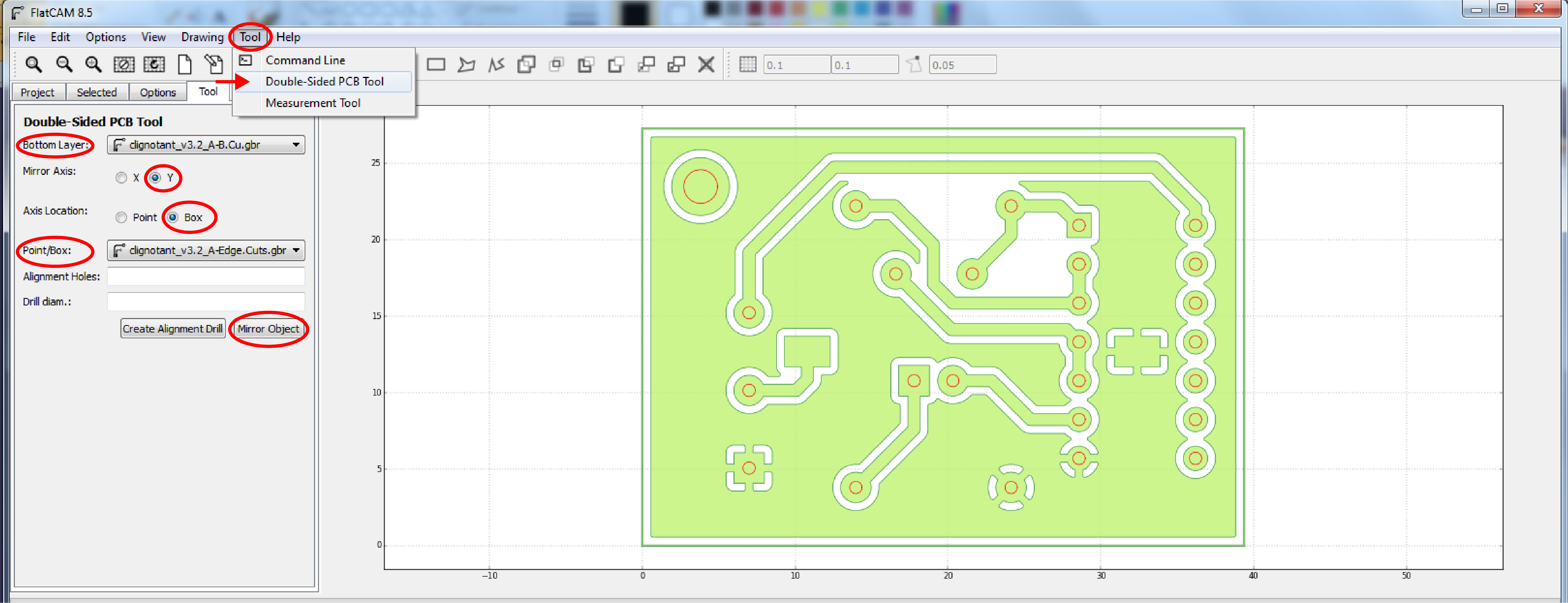 Bottom Layer: <nomprojet>-B.Cu.gbr Mirror Axis: Y Axis Location: Box Point/Box: <nomprojet>-Edge.Cuts.gbr