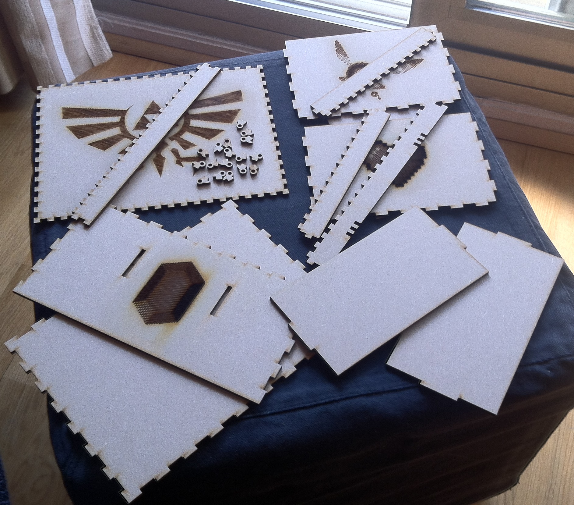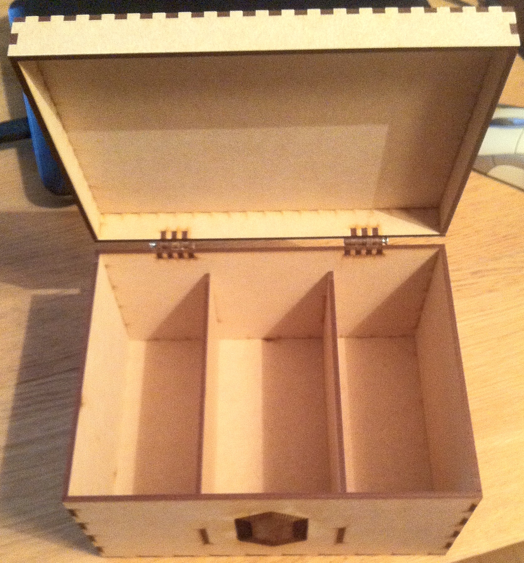 Une erreur d'inattention avec mon fichier m'a empêché de placer les panneaux pour compartimenter l'intérieur de ma boîte : j'ai oublié de prendre en compte l'épaisseur du fond de la boîte dans le placement des trous pour les compartiments ! J'ai donc corrigé mon fichier en conséquence, et découpé de nouveaux panneaux pour finaliser ma boîte.