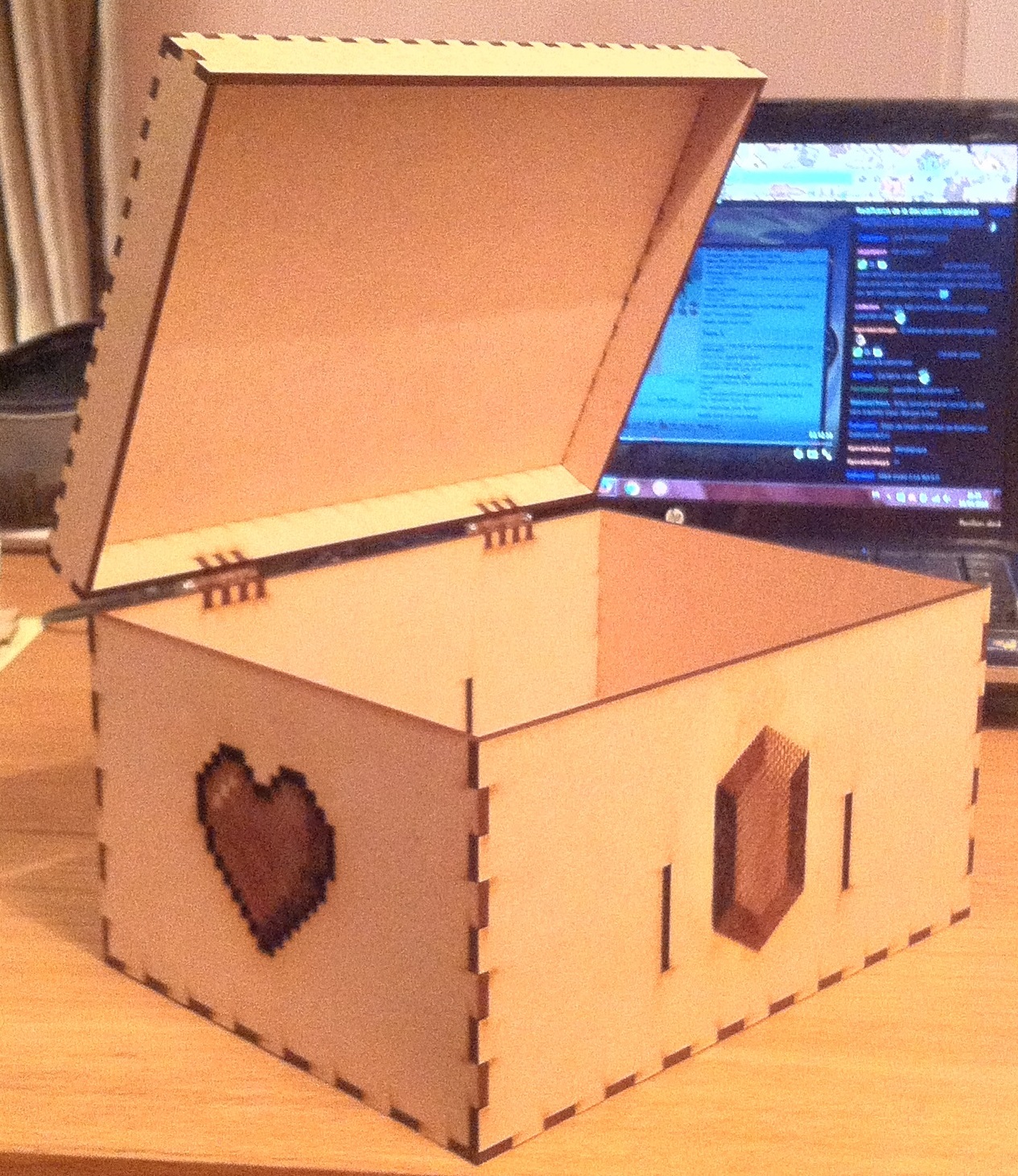 Une fois le travail de découpe terminé, j'ai assemblé les pièces de ma boîte en mettant un point de colle dans les encoches pour être sûre qu'elles tiennent (certaines étant plus lâches que d'autres). J'ai ensuite fixé les charnières avec deux boulons en acier à tête plate de 25 mm de long et 3 mm de diamètre (trouvables chez Leroy Merlin).