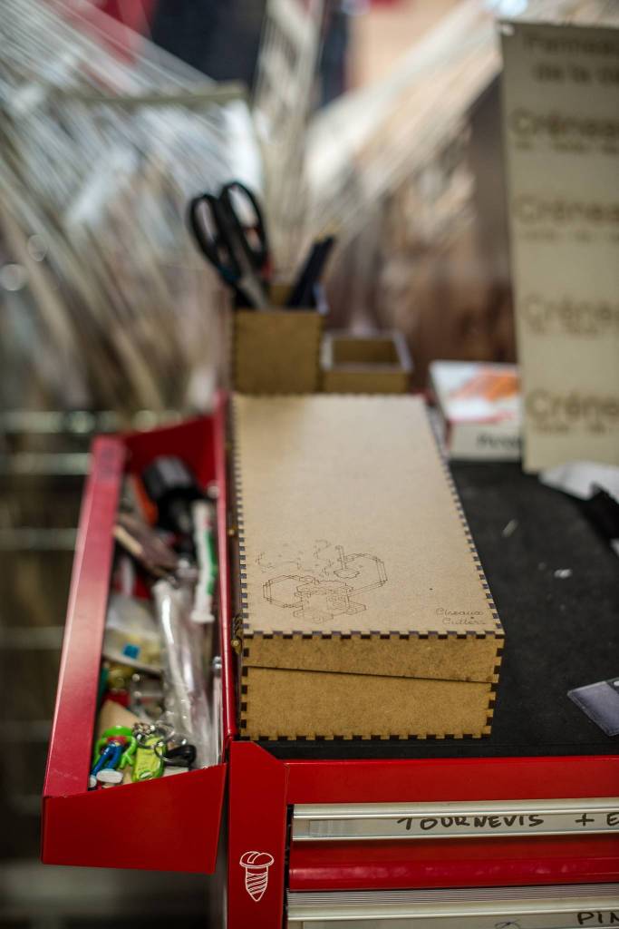 • Les cutters, scalpels et paires de ciseaux du Fablab sont rangés dans la desserte, souvent en vrac au fond des gros tiroirs bien fournis, et jamais au même endroit. Ces outils tranchants étant potentiellement assez dangereux j'y ai vu la nécessité de faire une boite fermée, où les y regrouper.