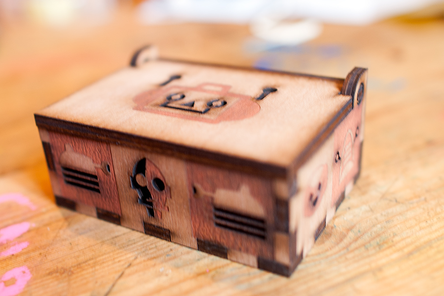 Nous voulions faire une jolie petite boite avec son couvercle, mais sans charnière, tout en contreplaqué 5mm. Nous nous sommes basés sur les habituelles boites à encoches, modifiée pour le couvercle. Les dessins de robots sont faits sous inkscape et rappelleront évidemment des robots connus… La gravure (légère) sur le contreplaqué lui change sa couleur et sa texture, le rendu ressemble alors à de la marqueterie.