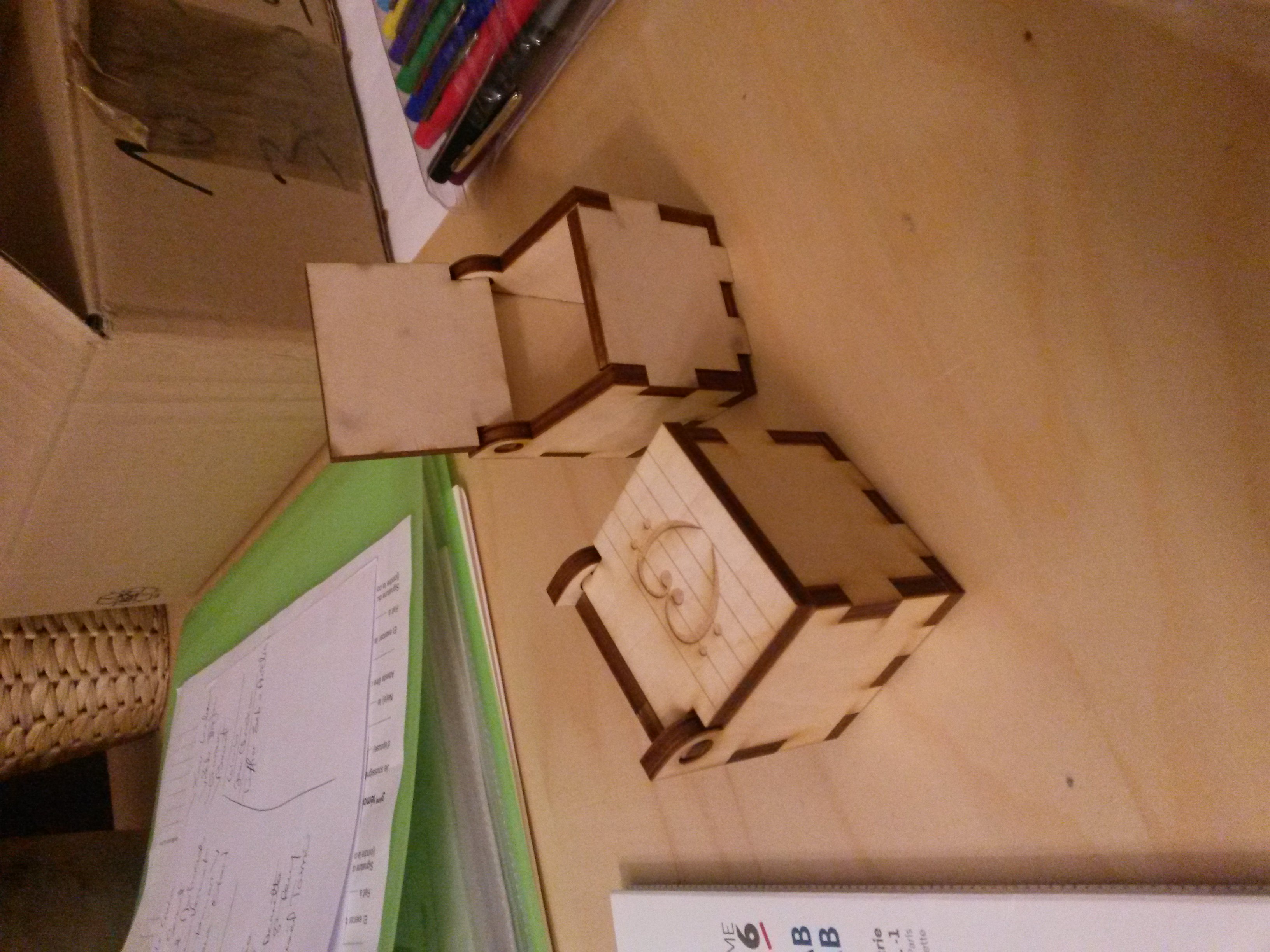 Le rendu des boîtes à encoches (finger joint) me plaisait et j'ai fini par trouver cette réalisation sur le wiki (Boite décorative robots) dont je me suis grandement inspiré, notamment pour réaliser la charnière du couvercle (merci à emilec et Emeline).