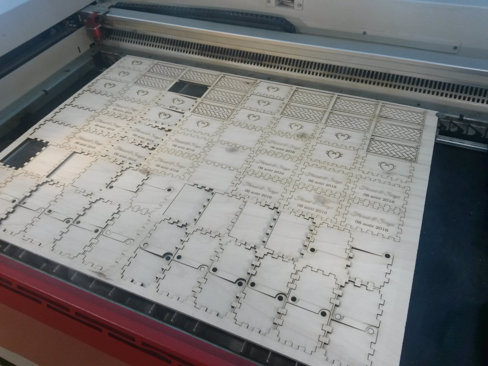 Le nombre total de boîtes à réaliser était de l'ordre de 80, il était donc important de bien définir le design final et de réduire au maximum le temps de découpe pour chaque boîte ainsi que les pertes de bois.