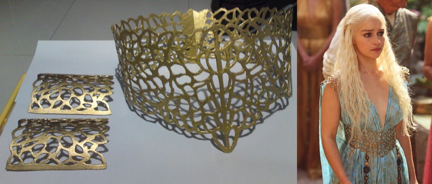 Cette dernière porte une magnifique robe bleue composée du ceinture et d'épaulettes en métal ajouré lors de son séjour dans la ville de Qarth.