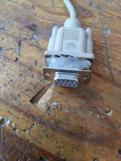 Comme je n'avais pas de câble série j'ai utilisé un câble VGA à une des extrémités duquel j'ai soudé en embout femelle. C'est assez moche mais ça fait le job.