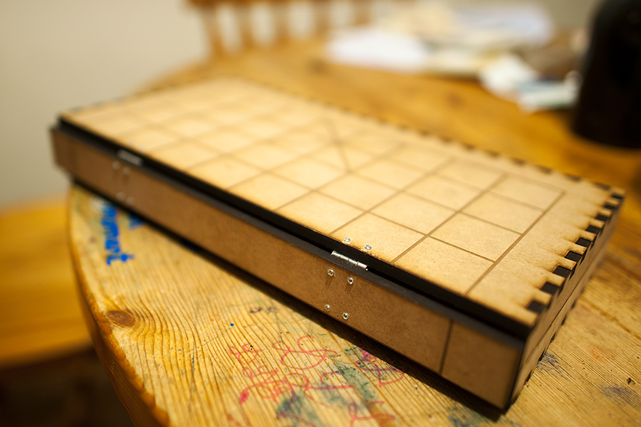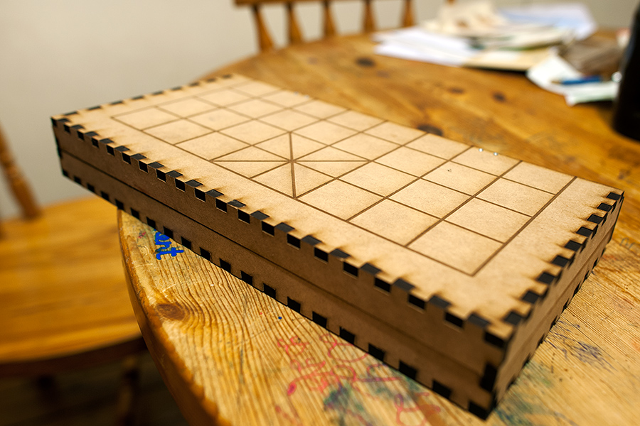 Le plateau comporte trois parties en MDF 6mm rattachées par 4 charnières : le fond et le couvercle symétriques qui forment les camps des joueurs ainsi que la tranche qui forme la “rivière” entre les deux camps. Les charnières sont fixées au MDF par des vis et écrous. L'ensemble a été réalisé en partant d'une boite générée par le software du fablab.