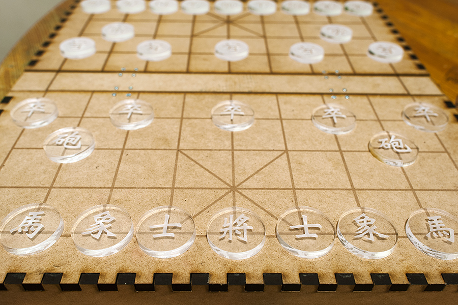 Un jeu d'échecs chinois dont les jetons sont en plexiglass et le coffret-plateau en MDF.