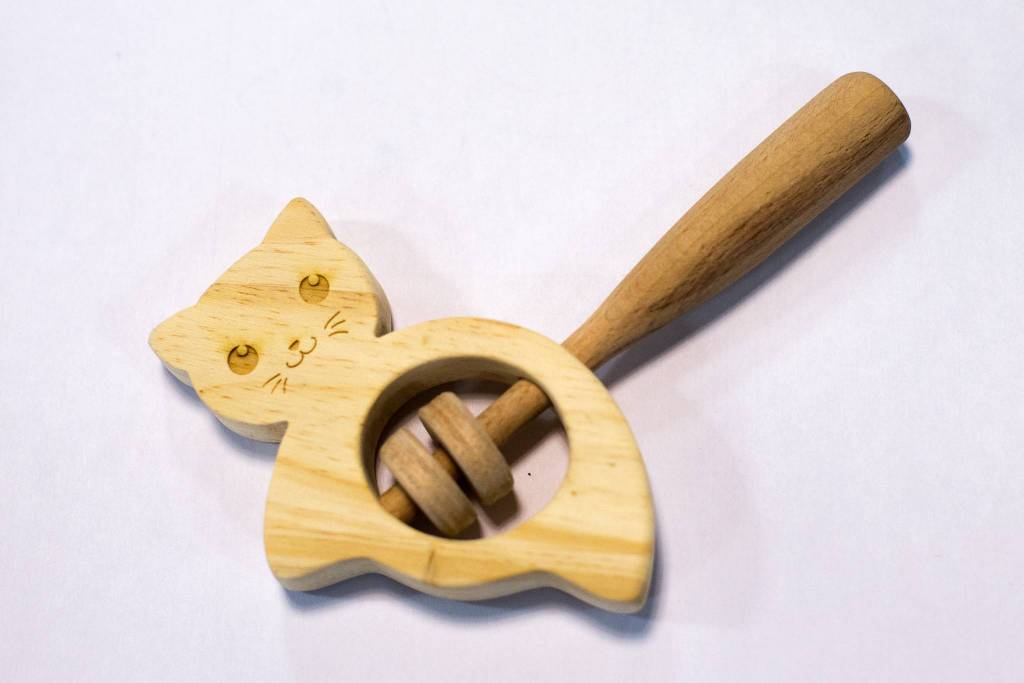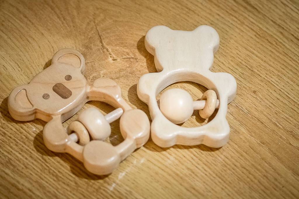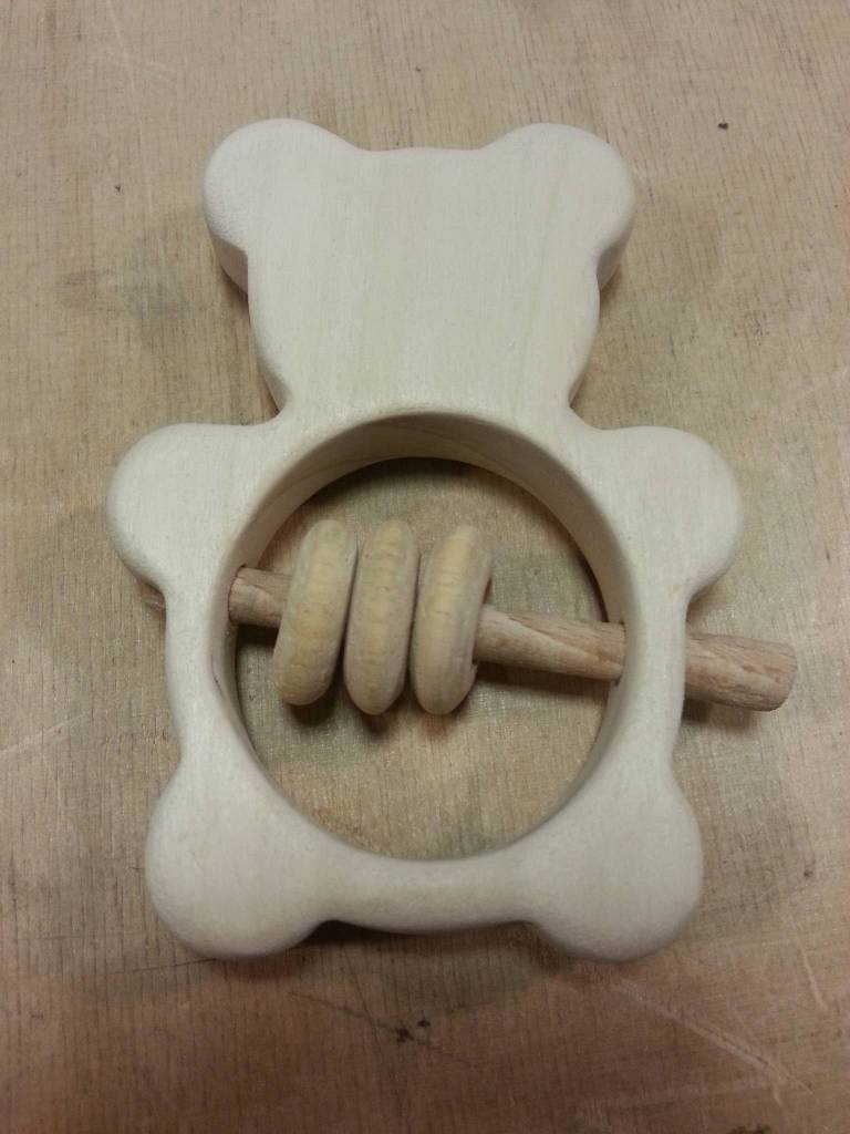 Un dernier petit coup de ponçage, quelques couches de vernis, collage du tourillon central et voila un nouveau hochet.