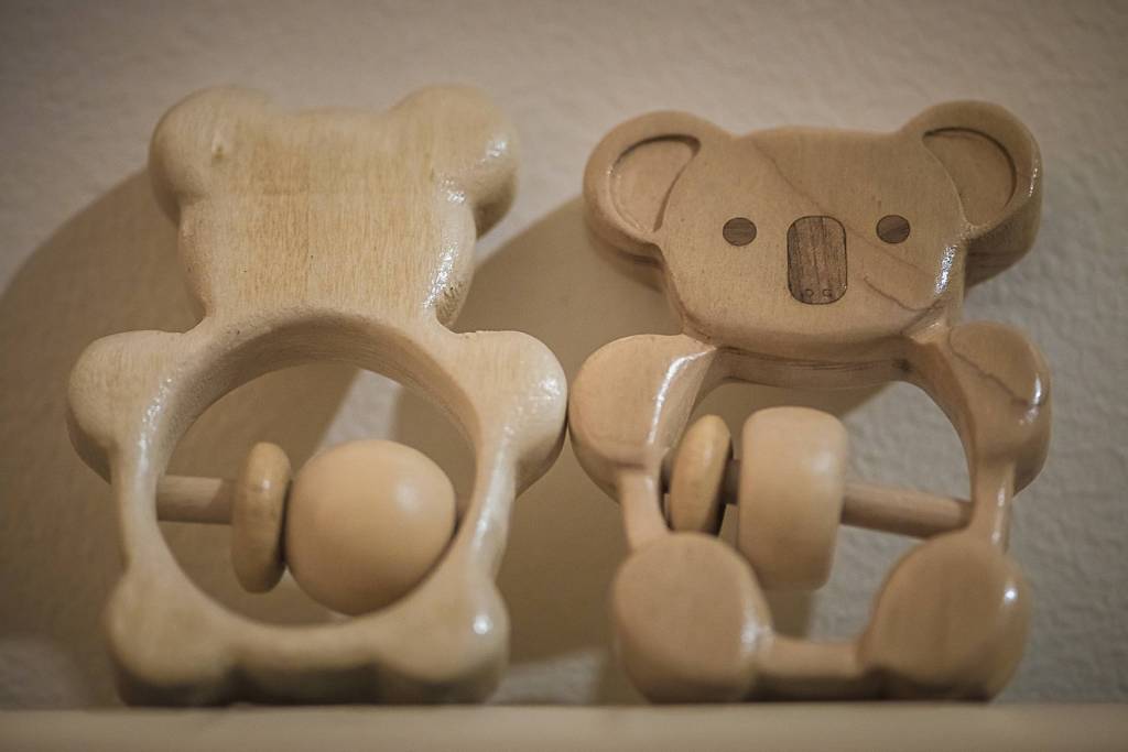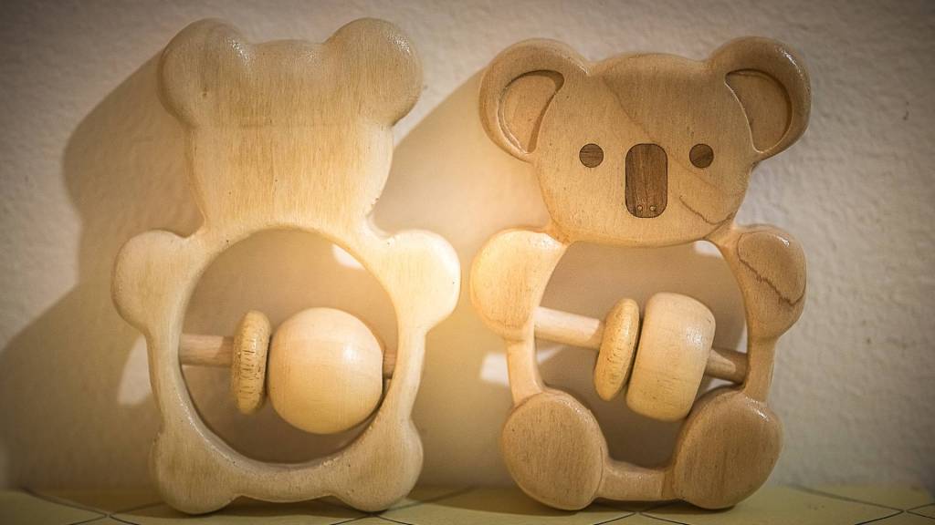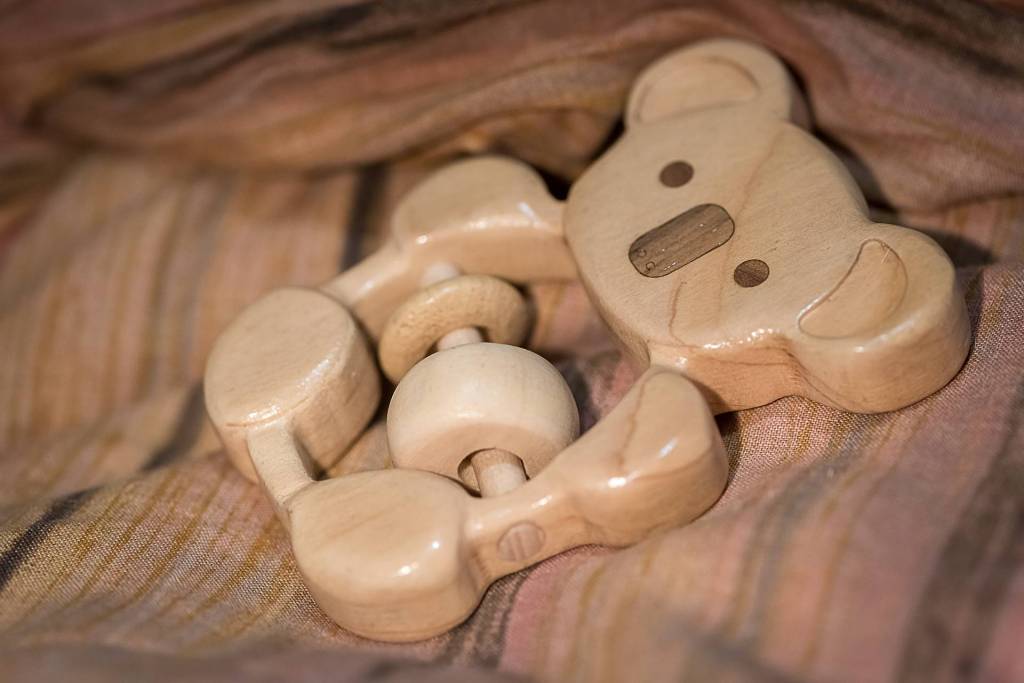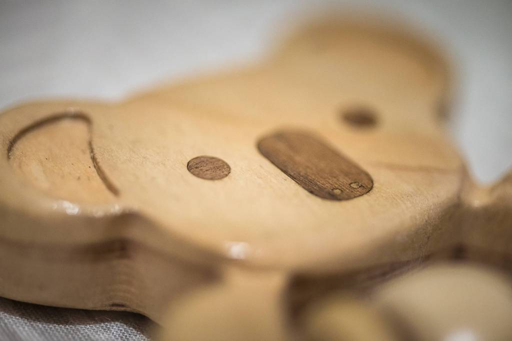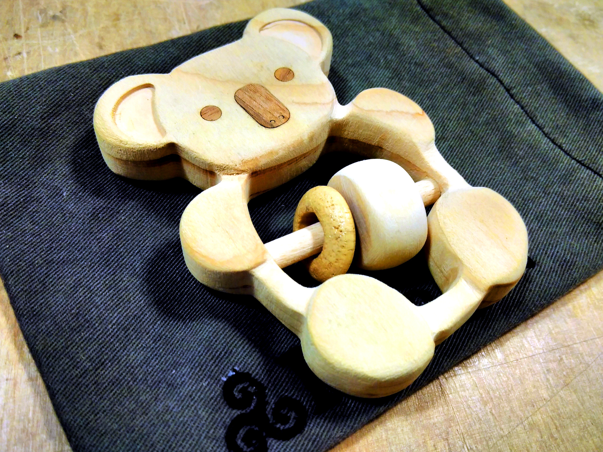 Pour ce dernier hochet en forme de koala j'ai aussi utilisé une fraiseuse cnc pour la découpe. Mais pour aller plus loin j'ai décider d'ajouter du relief sur certaines parties (pattes), et de la “marqueteries” (incrustation de bois de plaquage) réalisé à l'aide de la découpeuse laser.