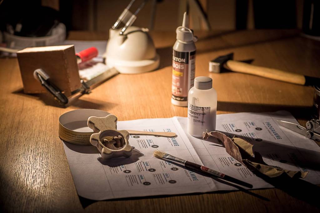 L'ensemble des pièces à ensuite été poncé à l'aide d'un papier de verre de grain fin, puis vernis (cf. figure 4) à l'aide de vernis acrylique (à l'eau) spécial jouets. puis collés à la colle a bois.
