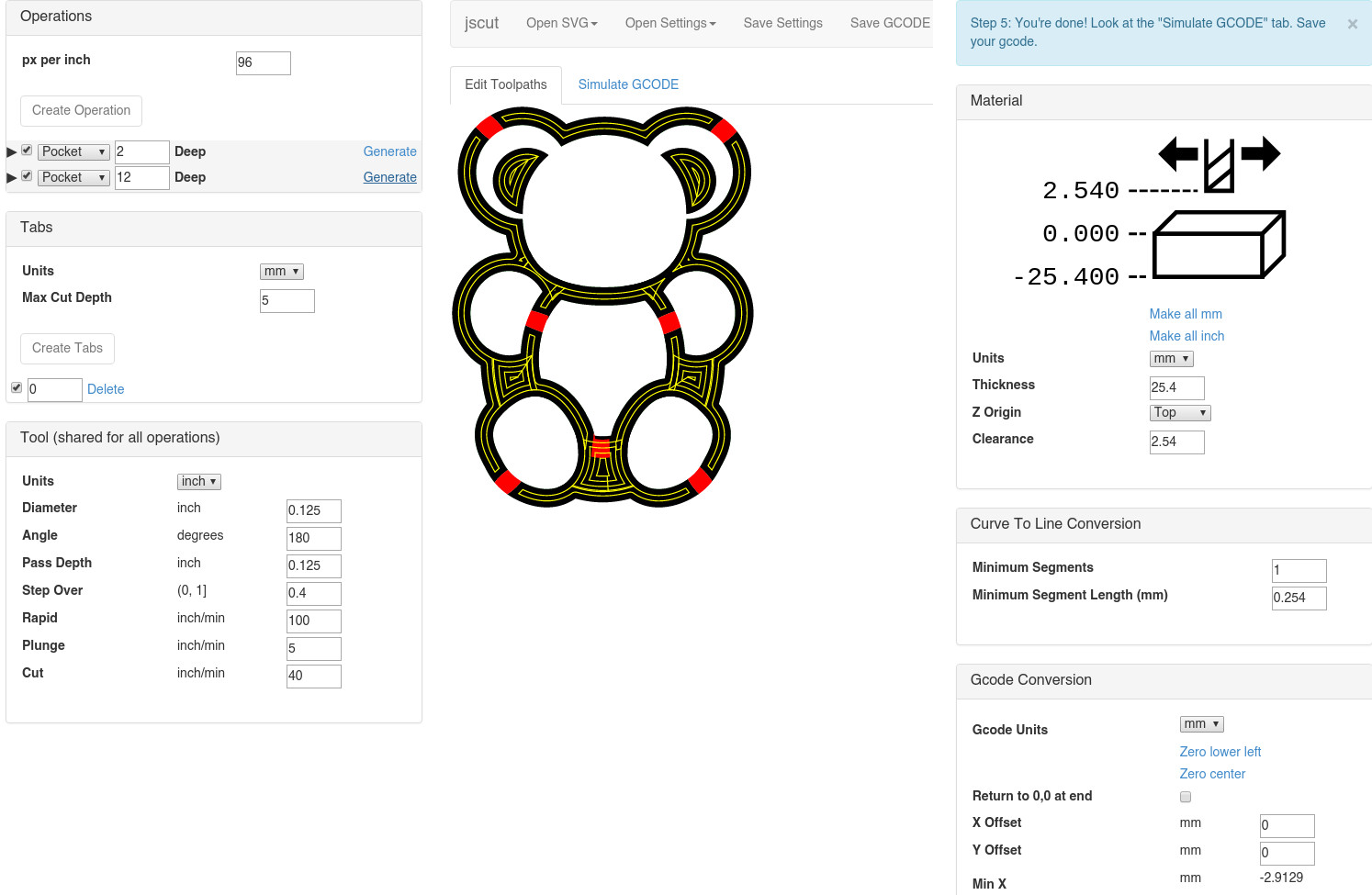 Fig. 10: Génération du gcode de découpe à partir du dessin svg avec JSCut
