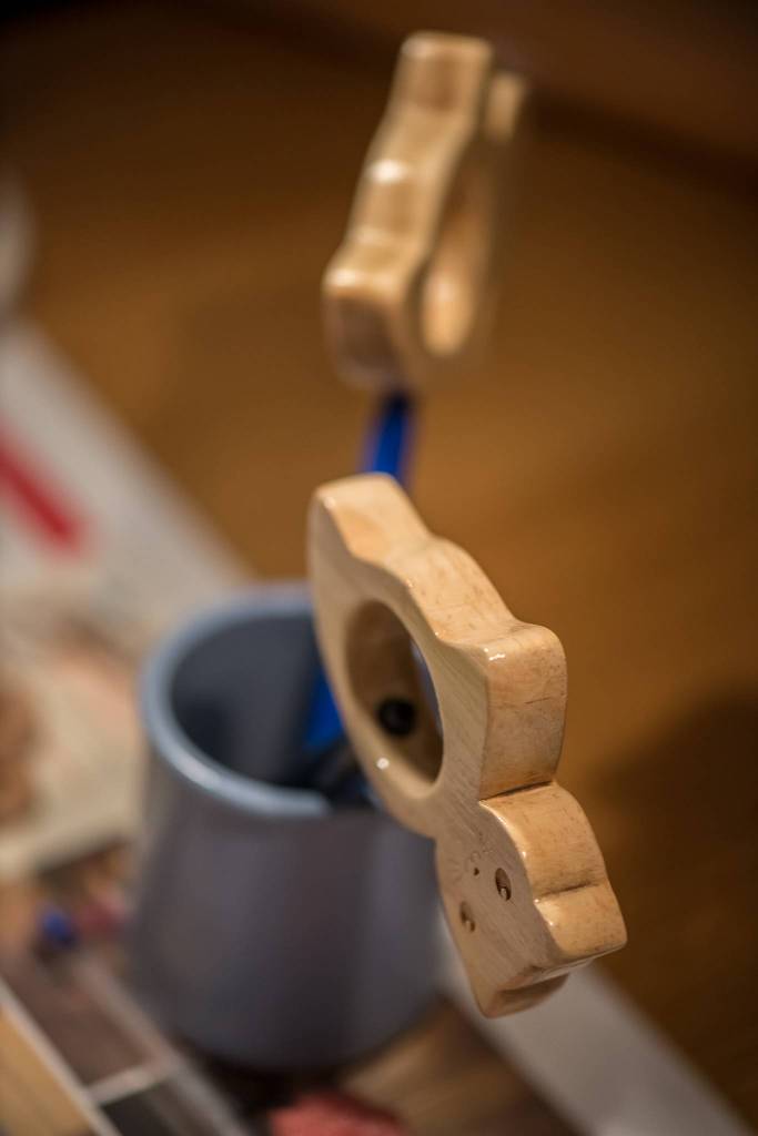 Les animaux seront doté d'un trou en leur centre dans lequel seront positionné des petits anneau en bois permettant de faire du bruit. Un tourillon traversant permettra de fixer ces anneau, et fera office de queue de l'animal, et de manche pour tenir le hochet.