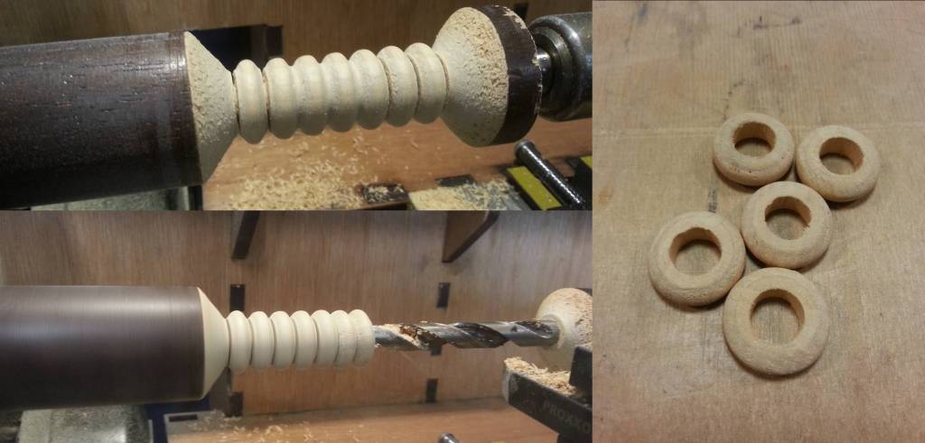 Pour les petits anneaux (cf. figure 5) utilisés pour le “grelot” j'ai utilisé des petites planchette de bois de récupération (noyer, frêne, …). Je l'ai découpés à l'aide d'une petite scie cloche, j'ai agrandi le tour central de chaque anneau à la perceuse à colonne puis passé un petit coup de papier de verre afin d'arrondir les angles.