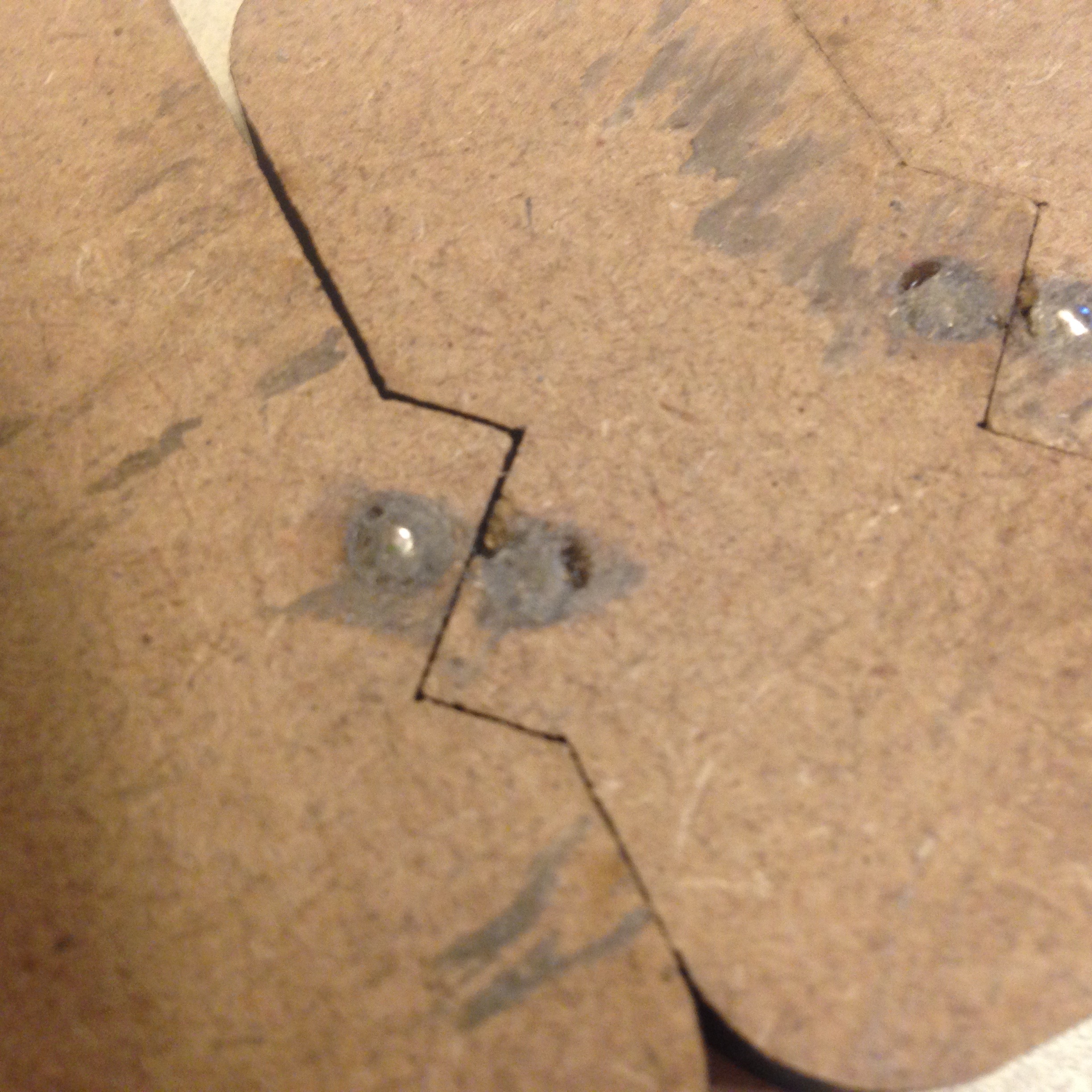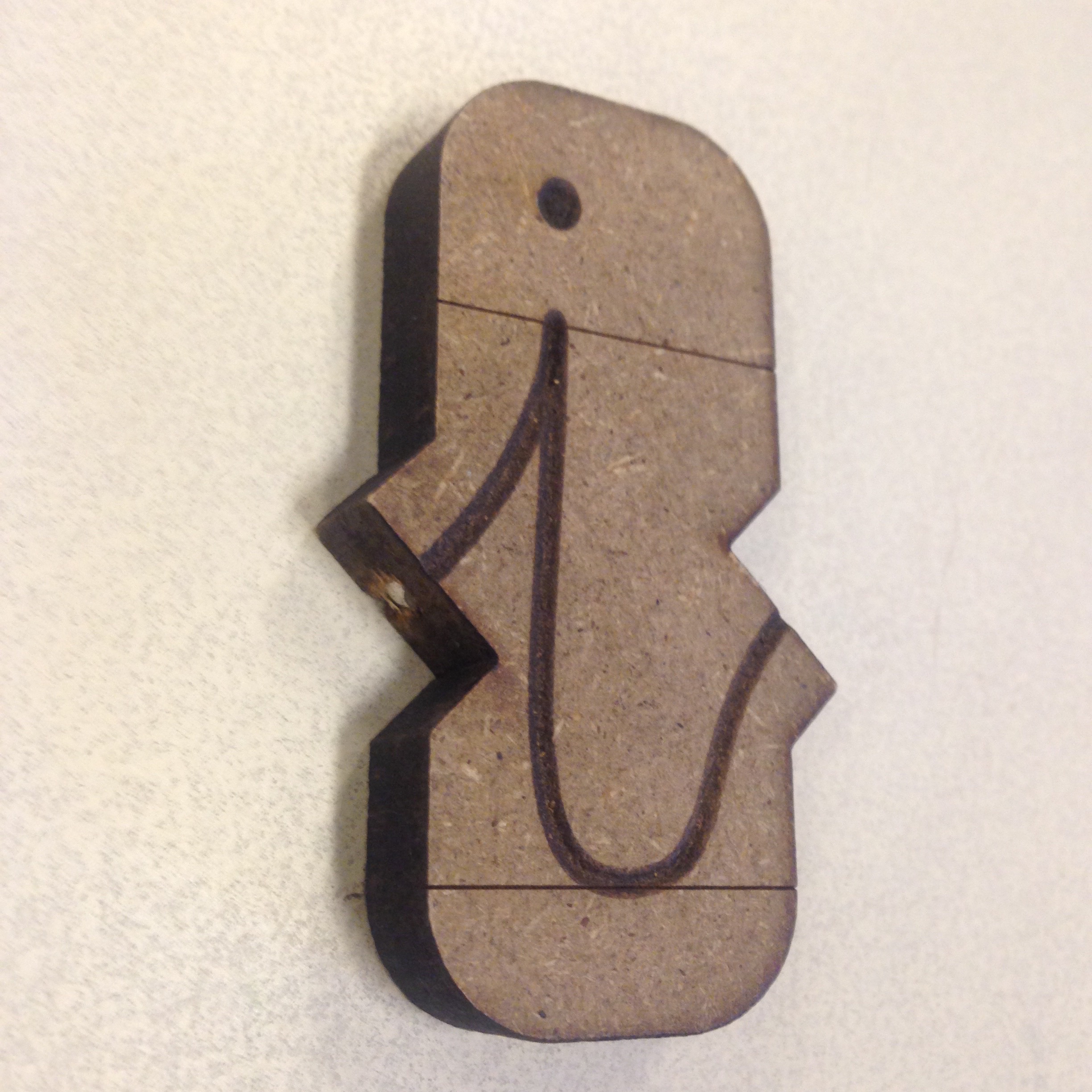 • Essai de matériau : le multipli de pin “batipin” se découpe très mal, il brule dans l'épaisseur, sans couper à travers. J'y ai consacré 15 d'essais de divers réglages du laser avant d'abandonner ce matériau pourtant joli.