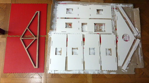 J'ai voulu compléter ce gros œuvre en faisant des éléments de charpente en contreplaqué, mais j'ai utilisé un matériau sans doute inadapté à ce genre d'usinage, et le résultat a été médiocre (avec une erreur de dimension en plus!). Je vais refaire ces éléments en MDF 6 mm.