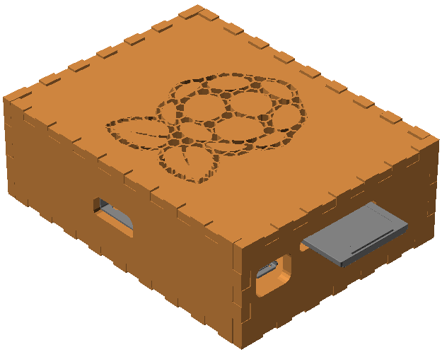 Réalisation d'un boîtier pour Raspberry Pi sans cous, ni vis, ni colle. Le Raspberry Pi sera utilisé pour une application de type média-center, c'est a dire qu'il sera branché en HDMI a une TV, que les ports analogique( vidéo/audio), ni les GPIO, ne seront utilisé.