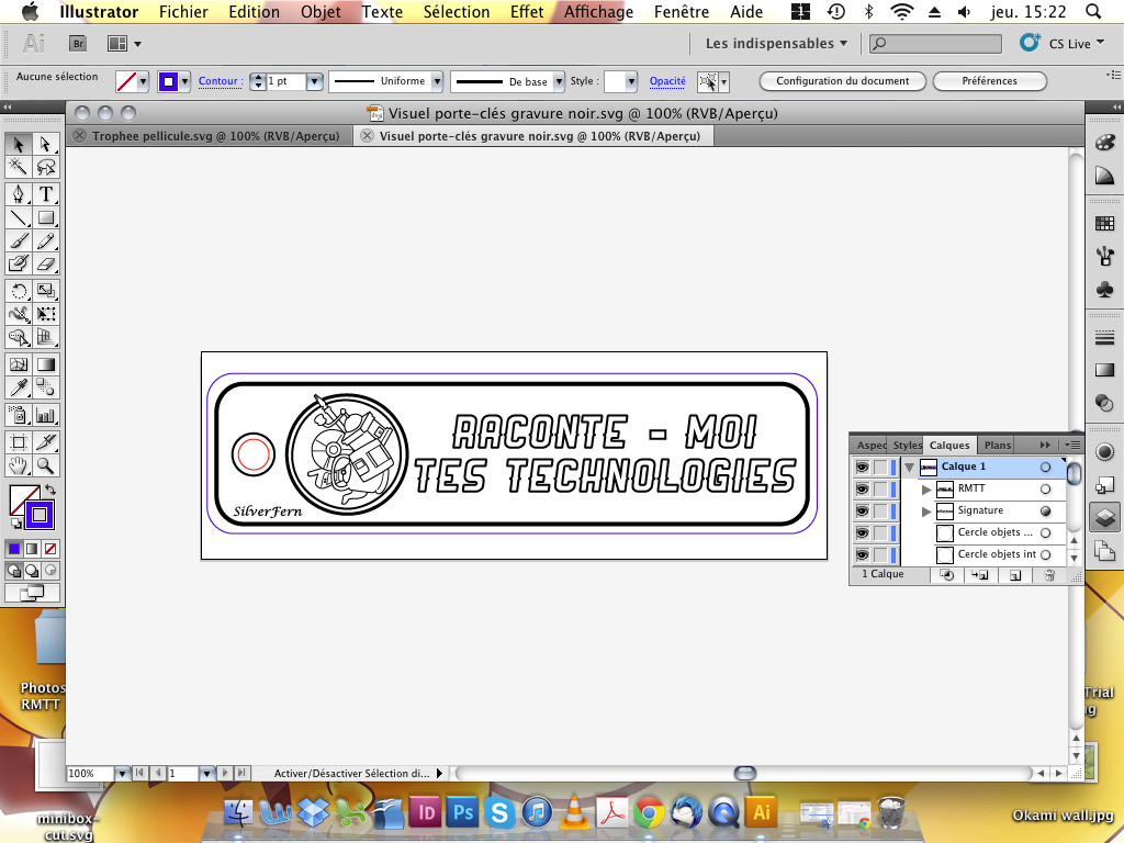 S'en est suivie la prise en main du logiciel de dessin vectoriel Inkscape pour réaliser le visuel des porte-clés, qui a aboutit (après quelques moments de bidouille et de recherches de tutos) à ce résultat : le rouge et le bleu pour la découpe, le noir pour la gravure.