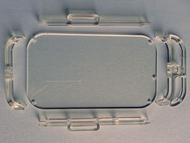 | Le fond en PMMA de 3mm et les flancs en PMMA de 10mm. Le PMMA de 10mm étant plutôt cher, les flancs sont en 4 parties rectilignes afin d'optimiser la surface de la plaque et de diminuer les chutes. Les trous de 3mm permettrons un positionnement précis lors du collage. → | ![]() |