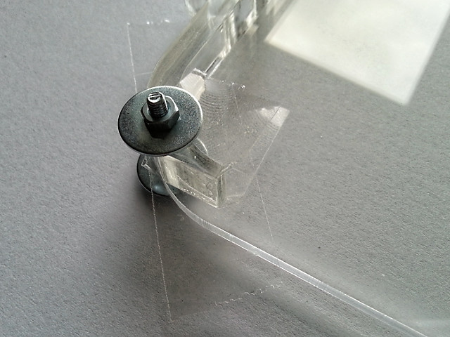 L'étanchéité des trous restants est assurée par du scotch résistant à l'humidité. On insère un petit poussoir en bois en face du bouton M/A. Le bouchon est serré avec 3 vis (ne pas trop forcer le PMMA est fragile).