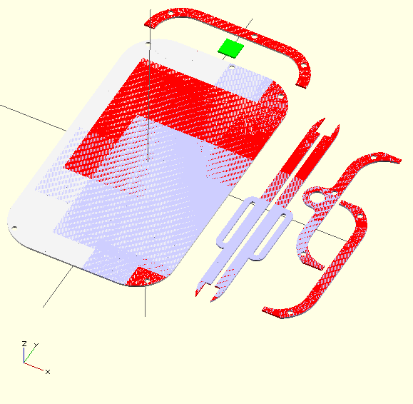 J'ai réalisé un modèle sous Openscad, plus complexe à coder au départ il supporte mieux les modifications qu'un dessin directement réalisé sous InkScape. De plus j'ai l'intention de décliner le modèle pour d'autres smartphones ou tablettes. Le fichier est ensuite exporté au format DXF pour l'importer dans Inkscape.