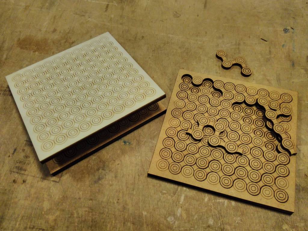 Réalisation d'un petit casse tête : un puzzle dont le motif à base de cercles, ne permet pas de distinguer les formes des pièces une fois monté.