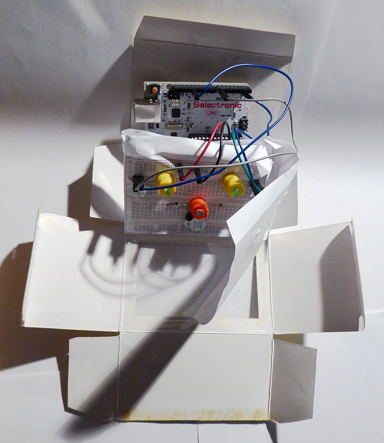 | En revenant à la maison, j'ai refait des essais de montage en plaçant des images de la breadboard imprimées sur papier entre les couches de cavaliers, de résistances et de composants. | J'ai réussi à tout placer (breadboard avec montage et carte arduino derrière) dans une petite boite en carton qui possède une fenêtre en plastique d'un côté. | Ce n'est pas encore très joli mais ça peut se transformer en une boite plus élaborée. |