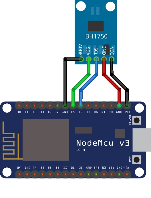 La connexion (bh1750) au node-MCU est assez simple. L'alimentation (3.3v & Masse) les deux broches i2c : nous utiliseront la broche `D5` pour SDA et `D6` pour SCL (ces broches sont configurables dans le programme). La broche ADD est mise à la masse pouer utiliser l'adresse par défaut du module.