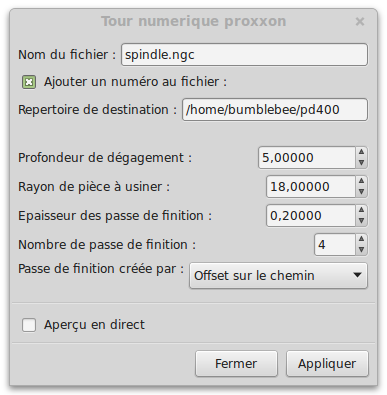 Sélectionner la courbe à usiner puis aller dans “Extensions » Fablab » Tour numérique proxxon et configurez votre usinage (cf. figure 3) (cocher la case Aperçu en direct pour visualiser vos modifications).