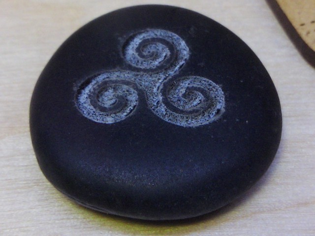 Chaque galet possède sa forme propre. Sa planéité est toute relative. Pour le stabiliser le plus à plat possible sur un support lors de la gravure, j'ai utilisé de la patte “Post it” sur le dessous.