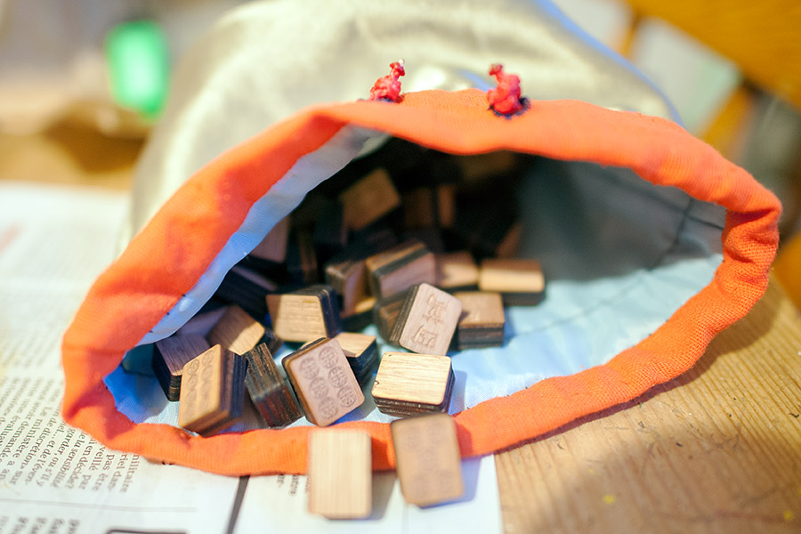 Les jetons en contreplaqué dans leur sac Les premiers jetons en plexiglass Les jetons en contreplaqué