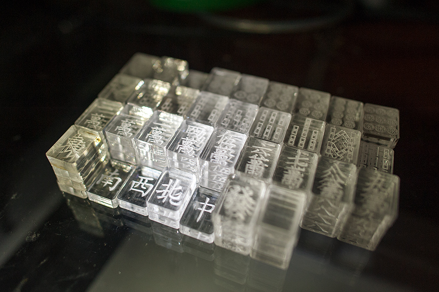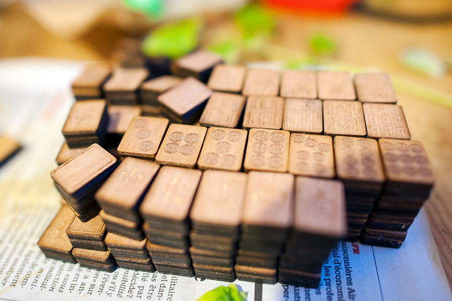 Nous pensions tout d'abord à des jetons dont la face serait en plexiglass et le fond en contreplaqué. Les deux matériaux seraient collés avec de la colle universelle transparente. Le rendu est très joli, mais malheureusement on peut alors lire le symbole d'une pièce face cachée par reflexion sur la tranche. Le jeu de mahjong est alors injouable. Nous avons donc choisi des pièces entièrement en contreplaqué.