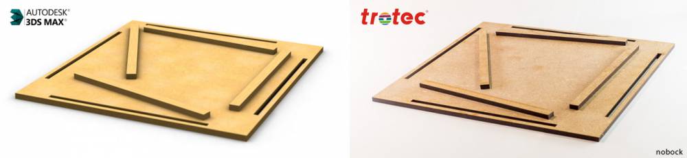 J'ai réalisé les plan en 3d sous 3ds max en utilisant des formes de 3mm d'épaisseurs en les combinant et en utilisant les tracés. La 3d m'a permis de bien visualiser le modèle ainsi que sont montage et démontage. Vu que je n'avais jamais utilisé la découpeuse laser j'ai d'abord découpé une planche de test avec différents réglages pour voir comment le mdf réagis. Vu que ça à fonctionné du premiers coup j'ai donc lancé le job. Ci dessous une image d'exemple avec une simulation 3d d'une pièce et sont rendu une fois découpés via la machine.