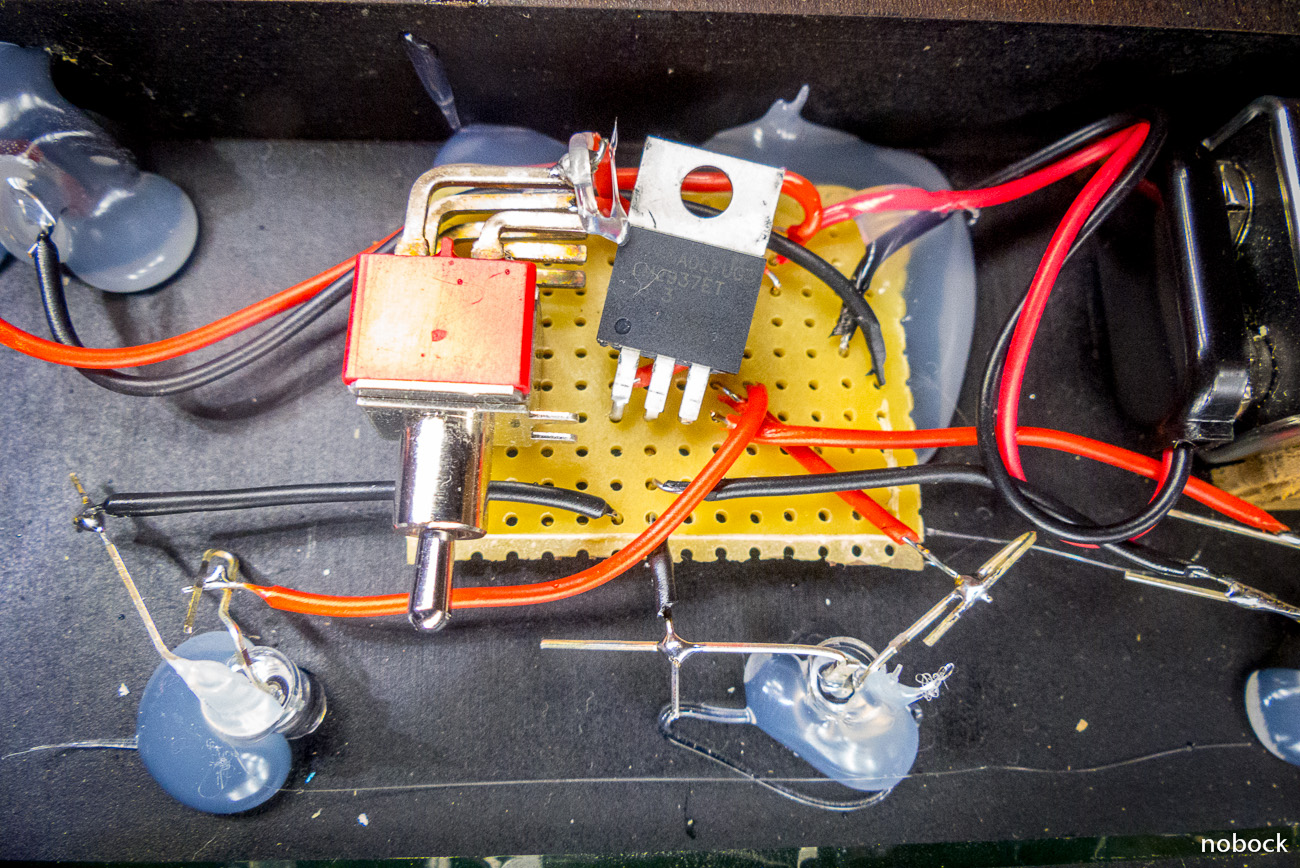 Pour la partie électronique j'ai simplifié au maximum. Exit arduino, moteur pas à pas et bandeau led. Je n'ai utilisé qu'un simple régulateur de tension 3.3v, 3 led, un interrupteur, un adaptateur pour pile 9v et un jack secteur le tout soudé sur une carte à pastille.