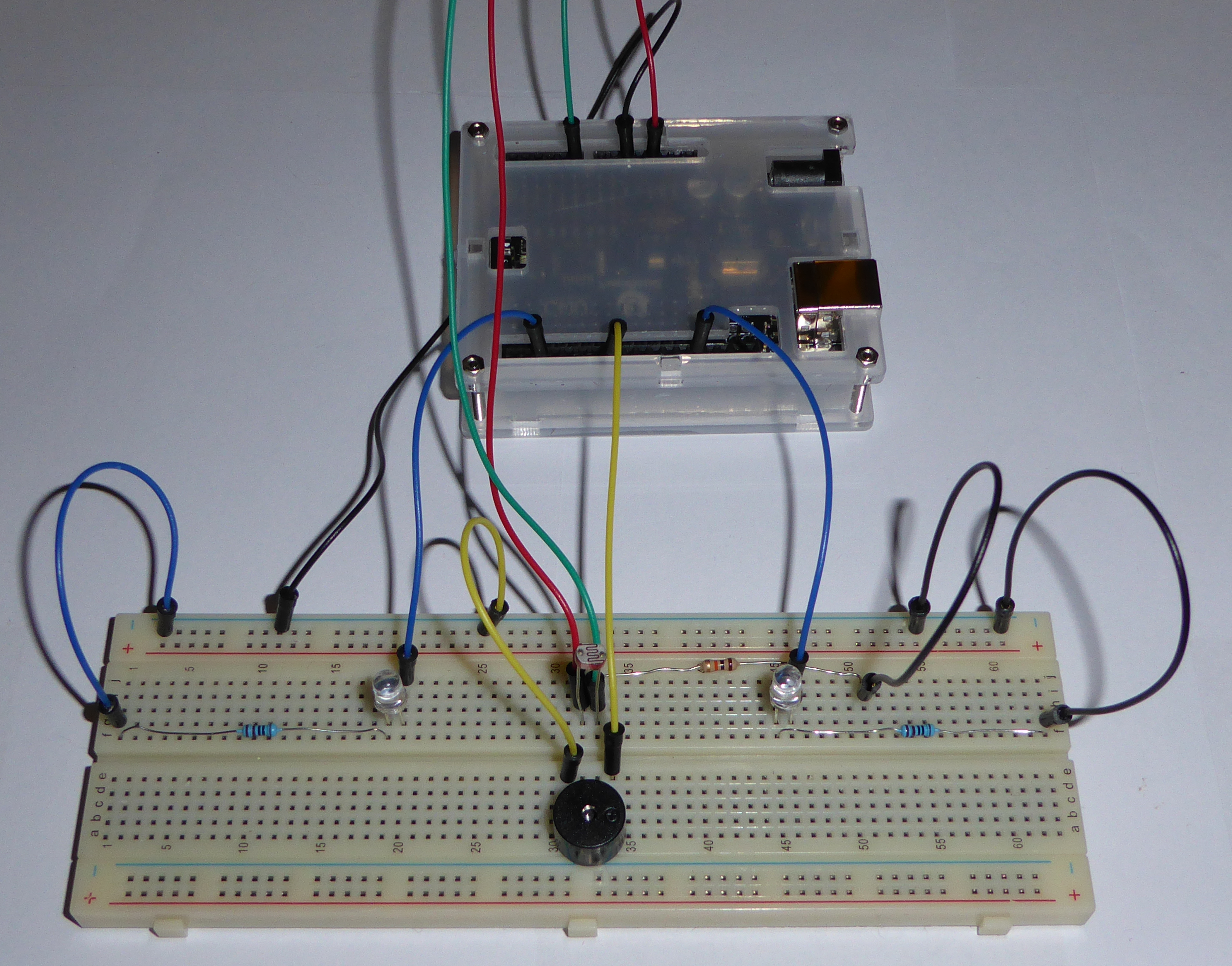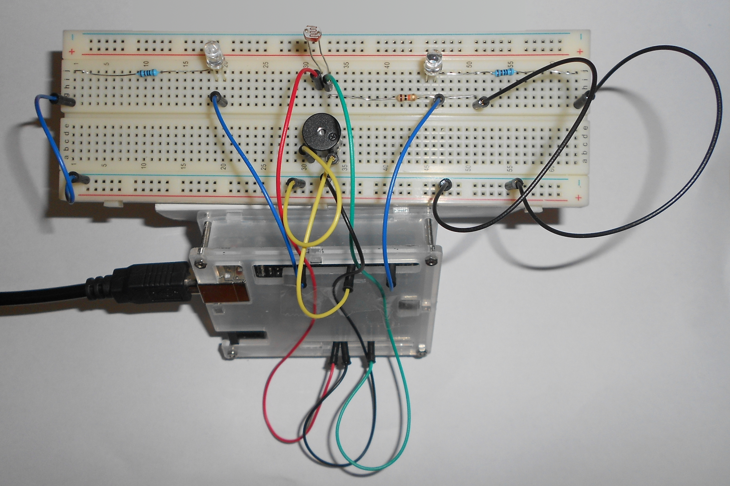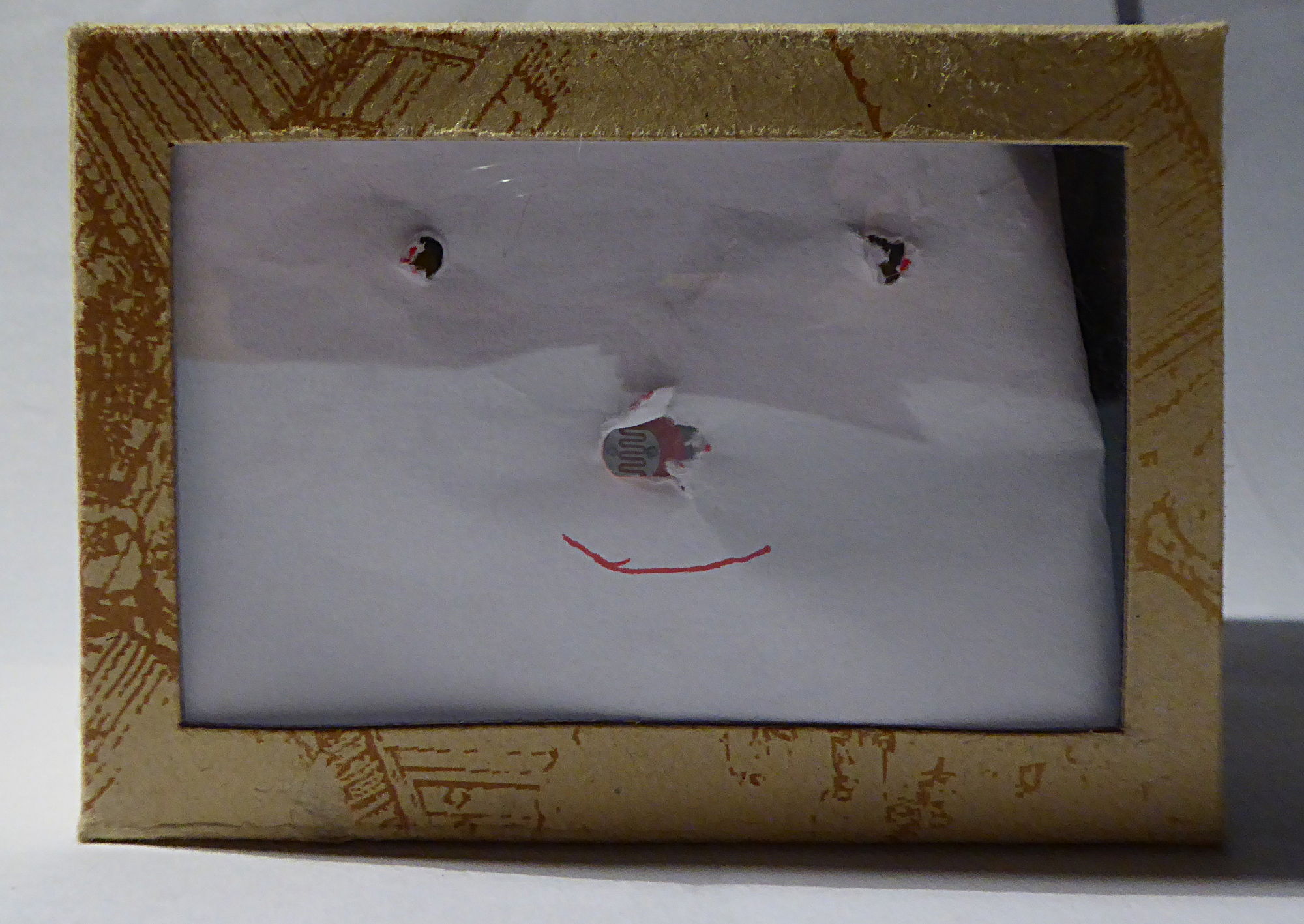 Le buzzer “crie” quand il y a peu de lumière (en cachant la photorésistance avec le doigt). Le buzzer s'éteint et les leds, représentant les yeux, clignotent quand la lumière est plus forte.