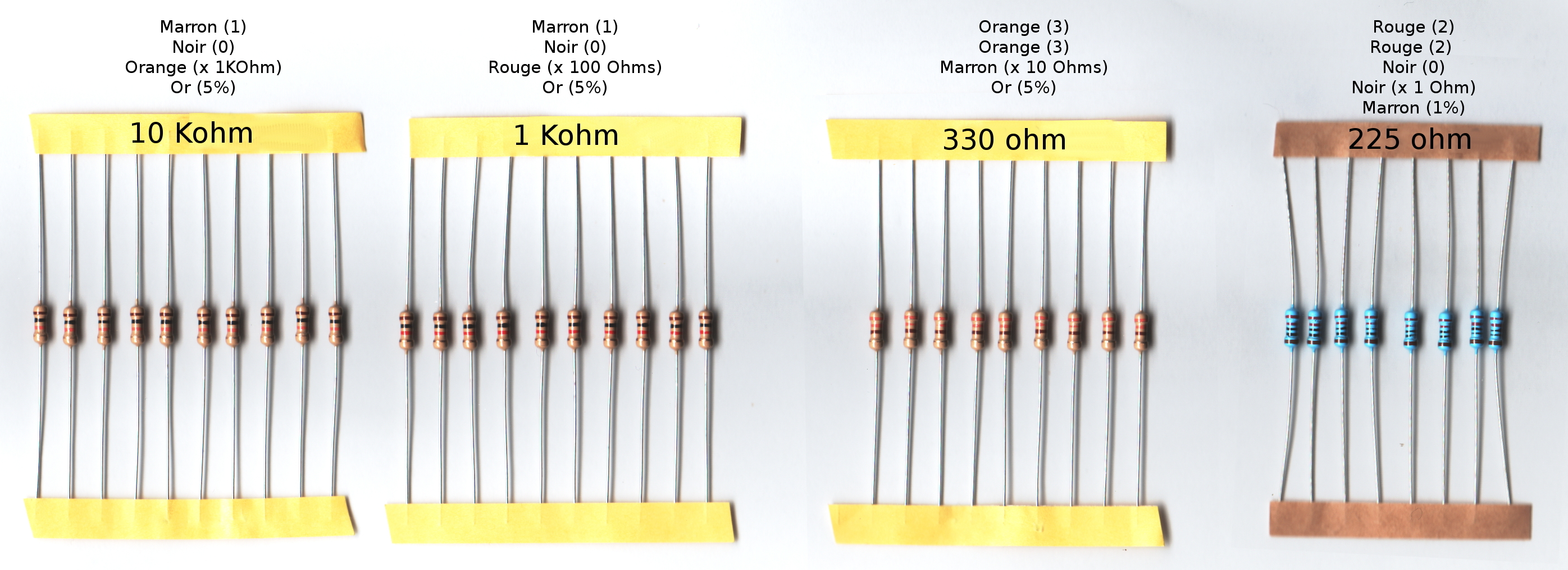 J'ai plié les bouts des résistances pour qu'elles soient aplaties contre la plaque. J'ai préparé un plateau avec des feuilles de papier blanc et ajouté 2-3 éléments à ma photo de droite avec Gimp.