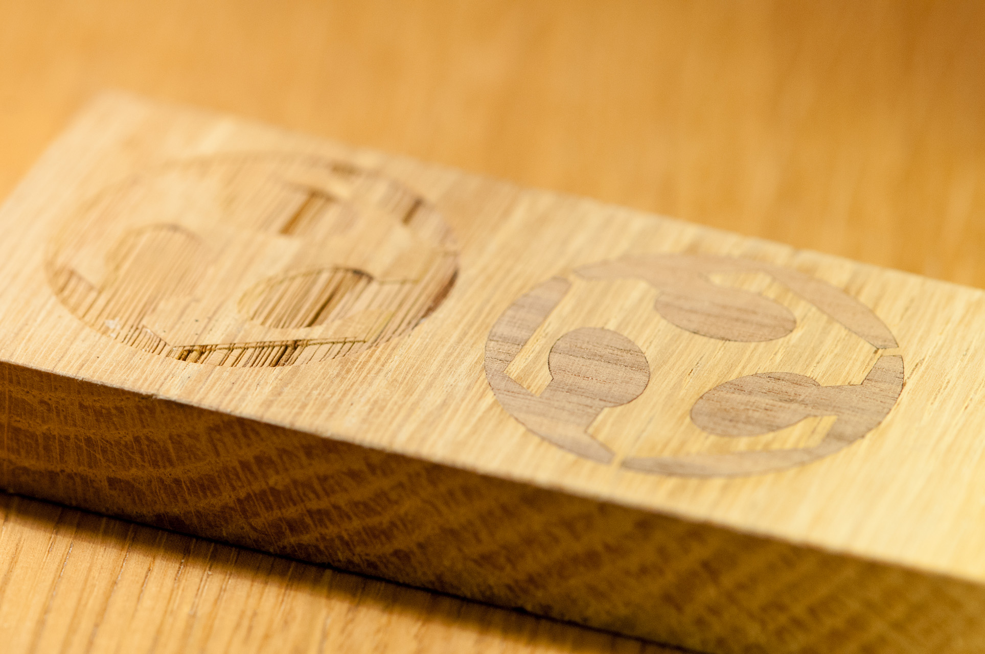- Incrustation/plaquage d'un logo fablab en bois de noyer dans un morceau de chêne brut. La partie de gauche montre un premier essais raté de gravure du bois de chêne pour recueillir le logo en bois de plaquage.