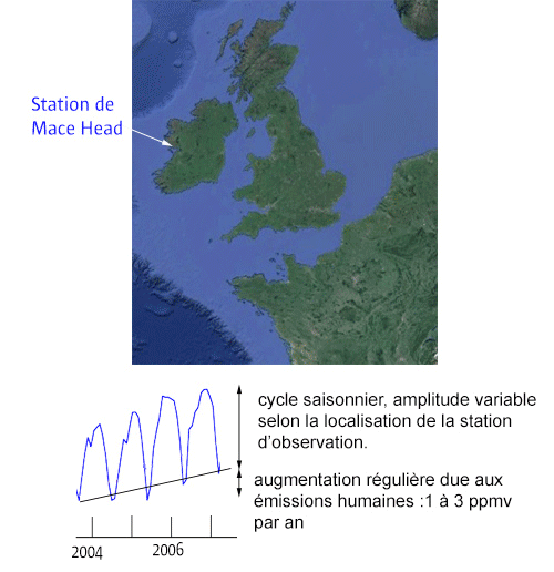 Mace Head est situé dans l'hémisphère nord, sur la côte ouest irlandaise. Le CO2 mesuré à Mace Head est fortement influencé par la végétation. Celle-ci suit un cycle saisonnier avec des phases de croissance de mars à septembre durant lesquelles les plantes absorbent du CO2 (photosynthèse) ; la concentration de CO2 baisse dans l’atmosphère. Le reste de l'année, la photosynthèse est moins active : la concentration de CO2 augmente dans l'atmosphère.